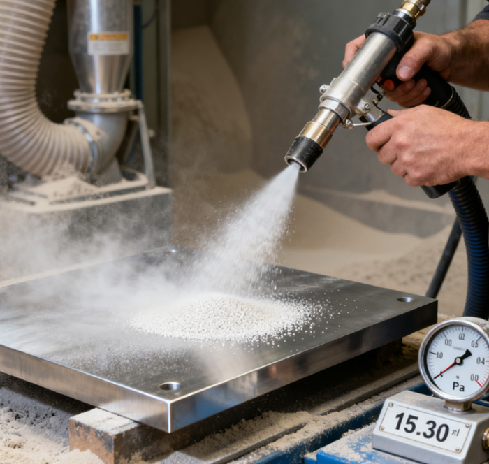 建议选用白刚玉磨料,压力控制在0.45 MPa以下,时间15-30秒,旨在去除粘砂、烧结层及部分氧化层。